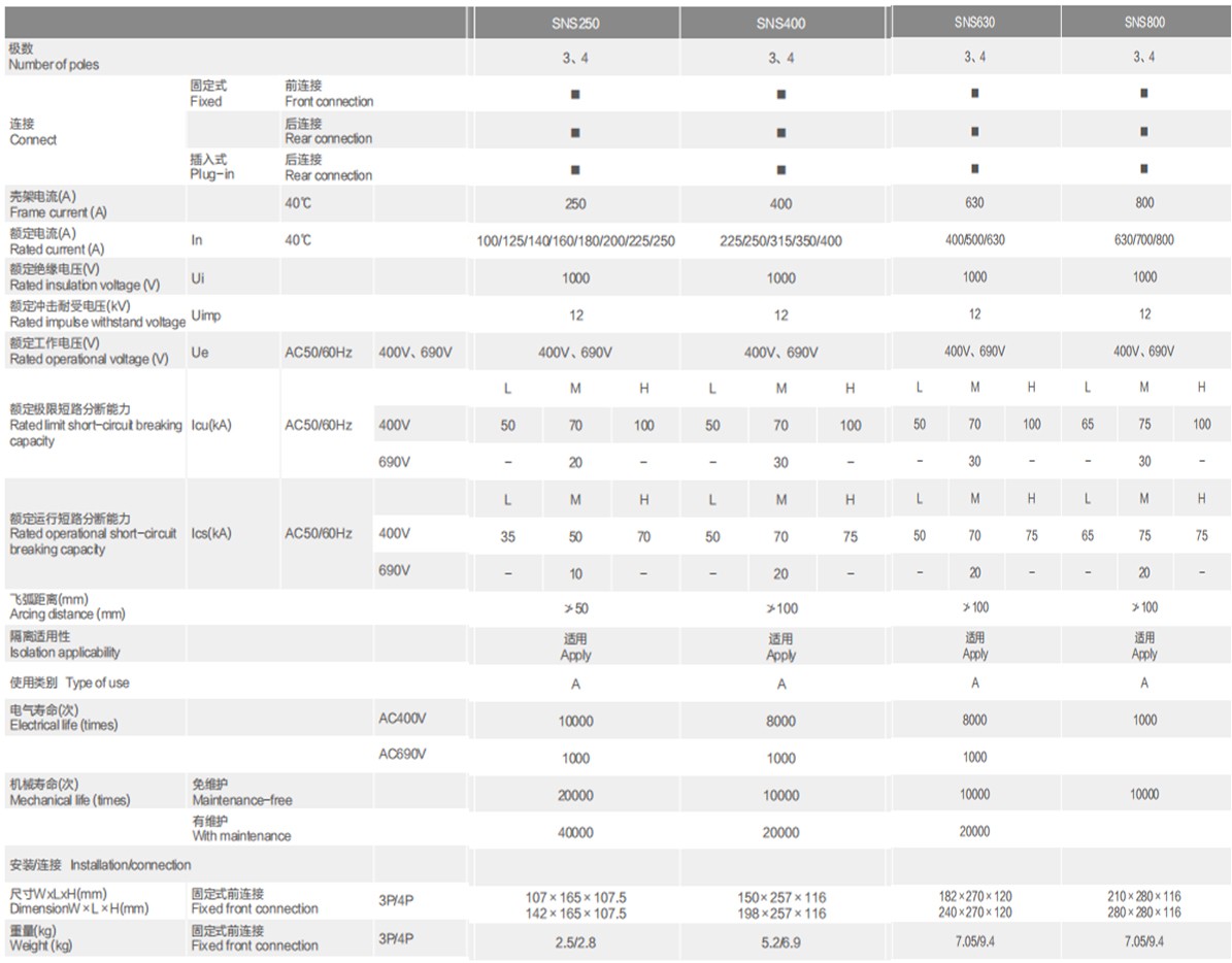 SNS thermal magnetic circuit breaker with overload, short circuit and undervoltage protection function, can protect the line and power equipment from damage. There are 63 type, 125 type, 250 type, 400 type, 630 type, 800 type six shell frame, current from 16A to 800A.