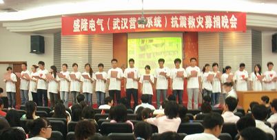 2008年6月12日晚,盛隆電氣(武漢)募捐晚會在武漢高科大廈4樓會議室舉行。晚會由副董事長謝清倫女士總策劃。出席晚會的有各營銷系統領導及代表、生產管理系統代表共200余人。與會全體人員為災區遇難同胞默哀,唱中華人民共和國國歌。副董事長謝清倫深情致辭并與各營銷處總經理一道,率先捐款。各部門負責人也帶領本部人員依...2008-06-13