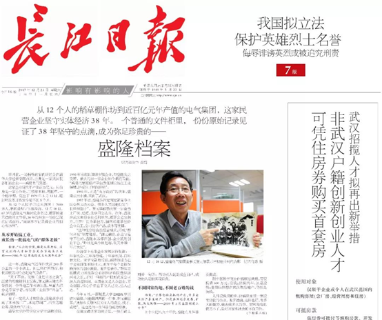 12月23日,武漢市委機關報《長江日報》在頭版頭條大篇幅刊登《盛隆檔案》,拉開了“解碼盛隆電氣實體經濟發展之路”系列報道的序幕。截止29日,該報連續7天在“要聞版”追蹤報道,引起強烈的社會反響。12月23日《長江日報》頭版12月23日《長江日報》要聞版03版12月24日《長江日報》要聞版04版12月25日《長江日報》要聞版07版...2017-12-29 -