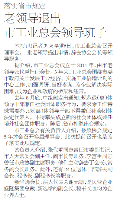 昨日,市工業(yè)總會召開理事會,一批老領(lǐng)導(dǎo)提出申請,辭去協(xié)會會長等領(lǐng)導(dǎo)職務(wù)。