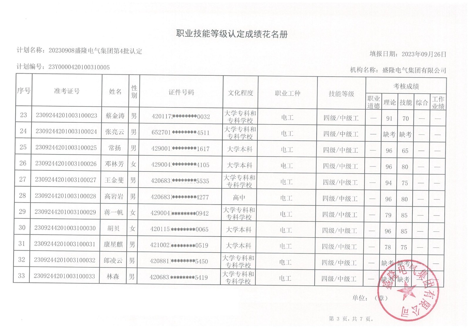 根據(jù)湖北省人力資源和社會保障廳《湖北省職業(yè)技能等級認定工作實施細則》(【2020】45號)文件的有關(guān)規(guī)定,現(xiàn)將盛隆電氣集團2023年第六批職業(yè)技能等級認定——電工(四級)、企業(yè)人力資源管理師(四級)成績予以公示,詳情見附件。