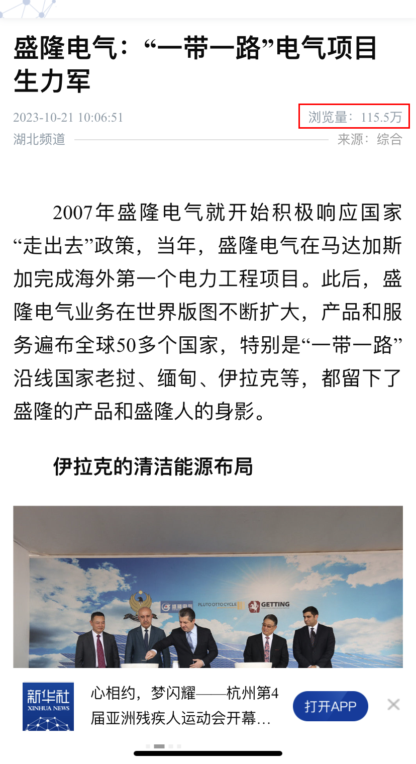 10月17日-18日,第三屆“一帶一路”高峰論壇在北京舉行。10月21日,新華社報道:《盛隆電氣:“一帶一路”電氣項目生力軍》,該稿件僅發布一天,瀏覽量就已經超過100萬,引發廣泛關注。盛隆電氣:“一帶一路”電氣項目生力軍記者:劉佳婧 2007年盛隆電氣就開始積極響應國家“走出去”政策,當年,盛隆電氣在馬達加斯加...2023-10-23 -