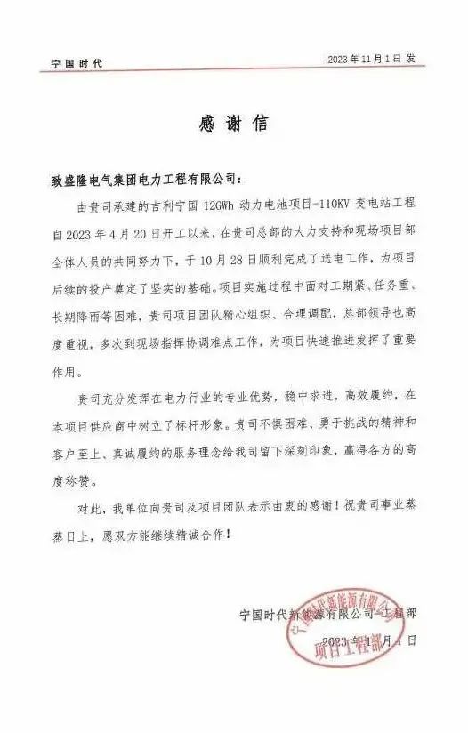 近日,由盛隆電氣集團電力工程有限公司承建的吉利寧國12GWh動力電池項目—110kV變電站工程成功送電。業主方寧國時代新能源有限公司發來一封感謝信,對盛隆電力在建設過程中展現的專業能力及優質服務表示感謝。感謝信該項目位于安徽省寧國市經濟技術開發區港口園區,專注于新能源汽車動力電池的生產與制造。寧國時代新能源...2023-12-15 -
