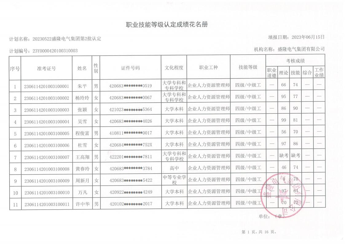 關(guān)于盛隆電氣第四批職業(yè)技能等級認(rèn)定成績的公示