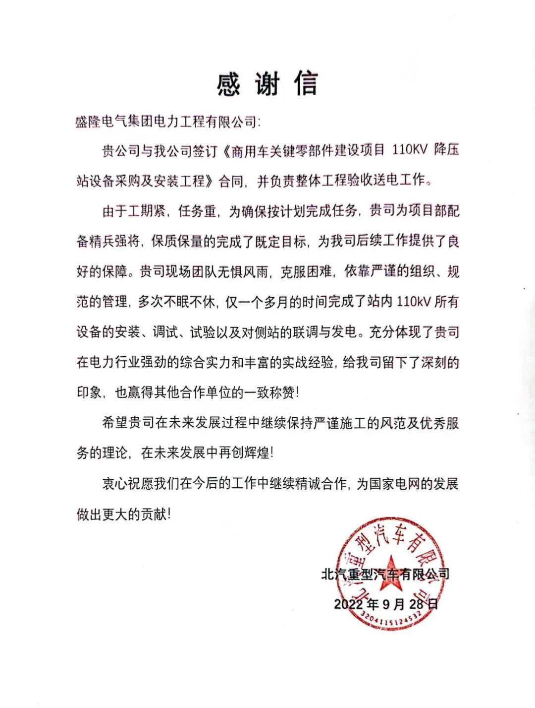 9月28日晚上8時8分,江蘇省常州市新北區(qū)韶山路18號,北汽重型常州商用車110kV降壓站項目內(nèi),所有人屏息以待。隨著電力調(diào)度人員指令的發(fā)出,運行操作人員合上開關(guān),降壓站一次送電成功!僅用50天,盛隆電氣克服工期短、難度大等困難提前通電,以強勁的綜合實力、豐富的實戰(zhàn)經(jīng)驗,贏得業(yè)主單位稱贊。北汽重型汽車公司發(fā)來感謝...2023-03-10