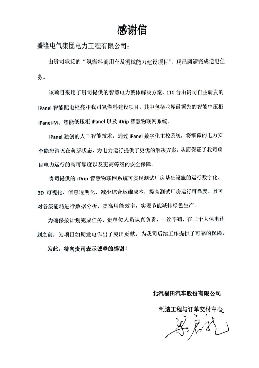 近日,北汽福田氫燃料建設(shè)項目順利送電,盛隆電氣為其提供個性化的智慧電力解決方案,并以“明星產(chǎn)品”iPanel智能配電柜和iDrip智慧物聯(lián)網(wǎng)系統(tǒng)的亮眼表現(xiàn),以及扎實的技術(shù)和優(yōu)質(zhì)的服務(wù),獲得了業(yè)主方、供電公司等單位的一致好評。業(yè)主方特別發(fā)來感謝信,對盛隆電氣表示高度認(rèn)可和贊譽,并表示,此次順利送電,為其“二十大...2023-04-12 -