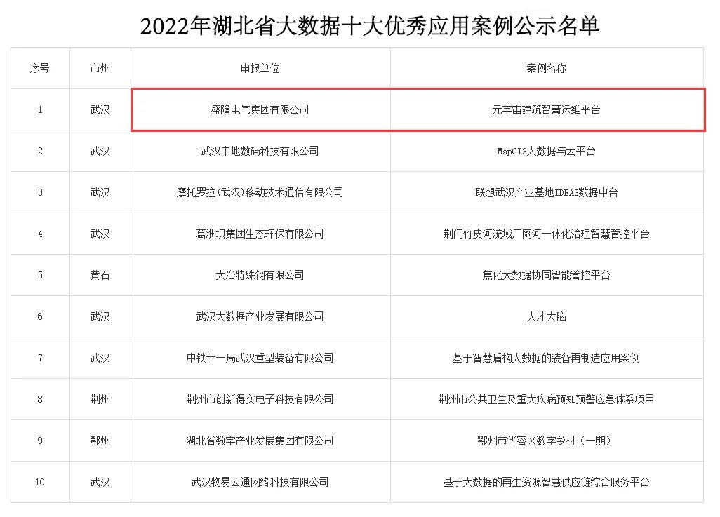 盛隆電氣元宇宙建筑智慧運維平臺獲評“2022年湖北省大數(shù)據(jù)十大優(yōu)秀應(yīng)用案例”