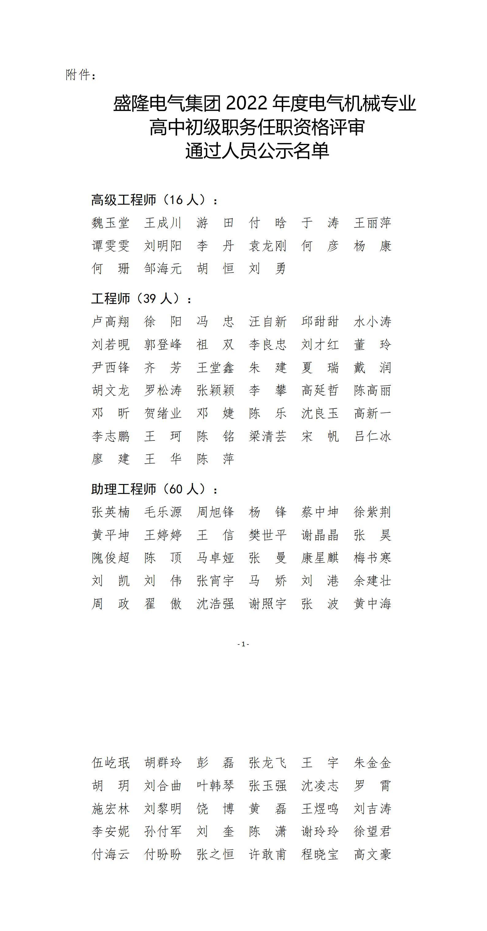 盛隆電氣集團2022年度電氣機械專業(yè)高中初級職務(wù)任職資格評審結(jié)果公示
